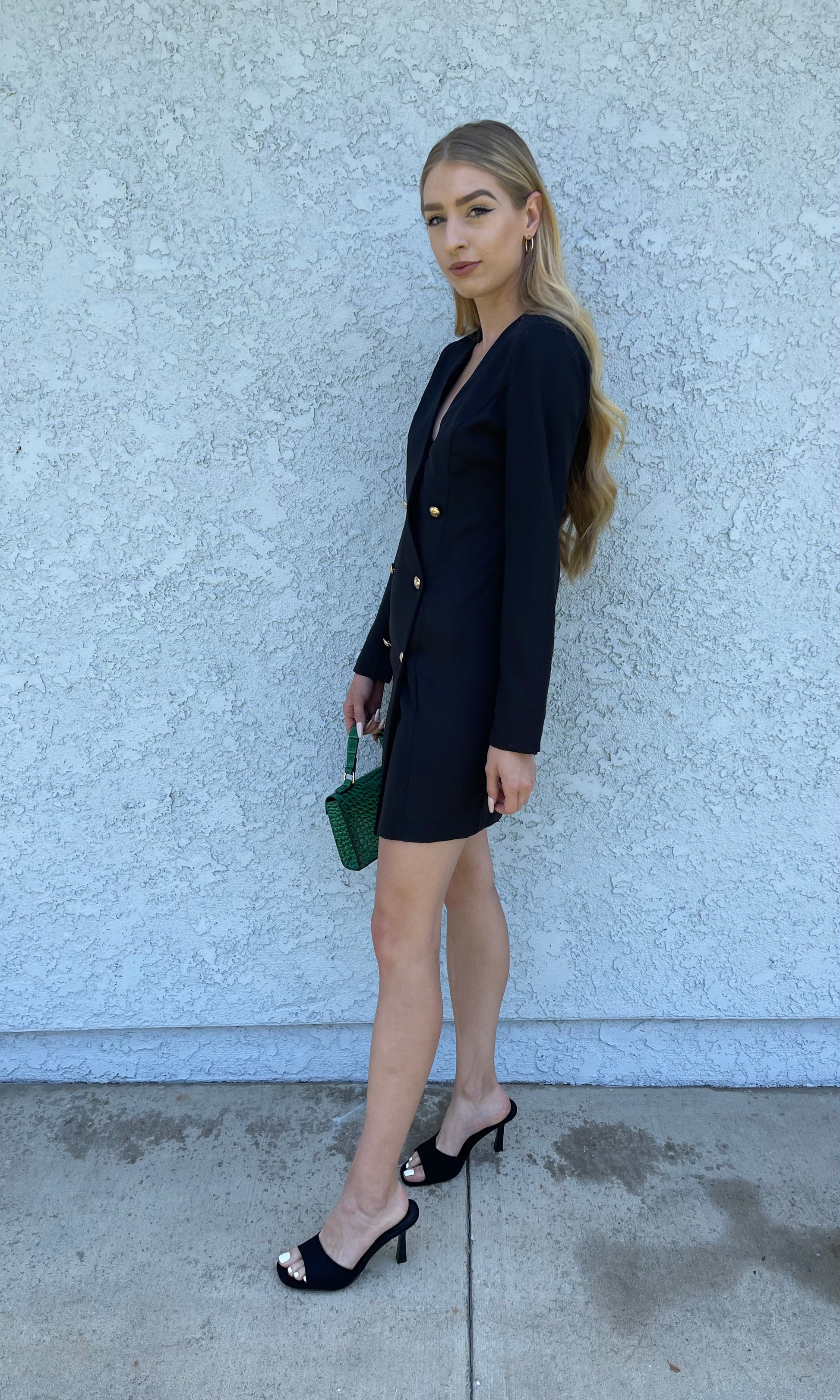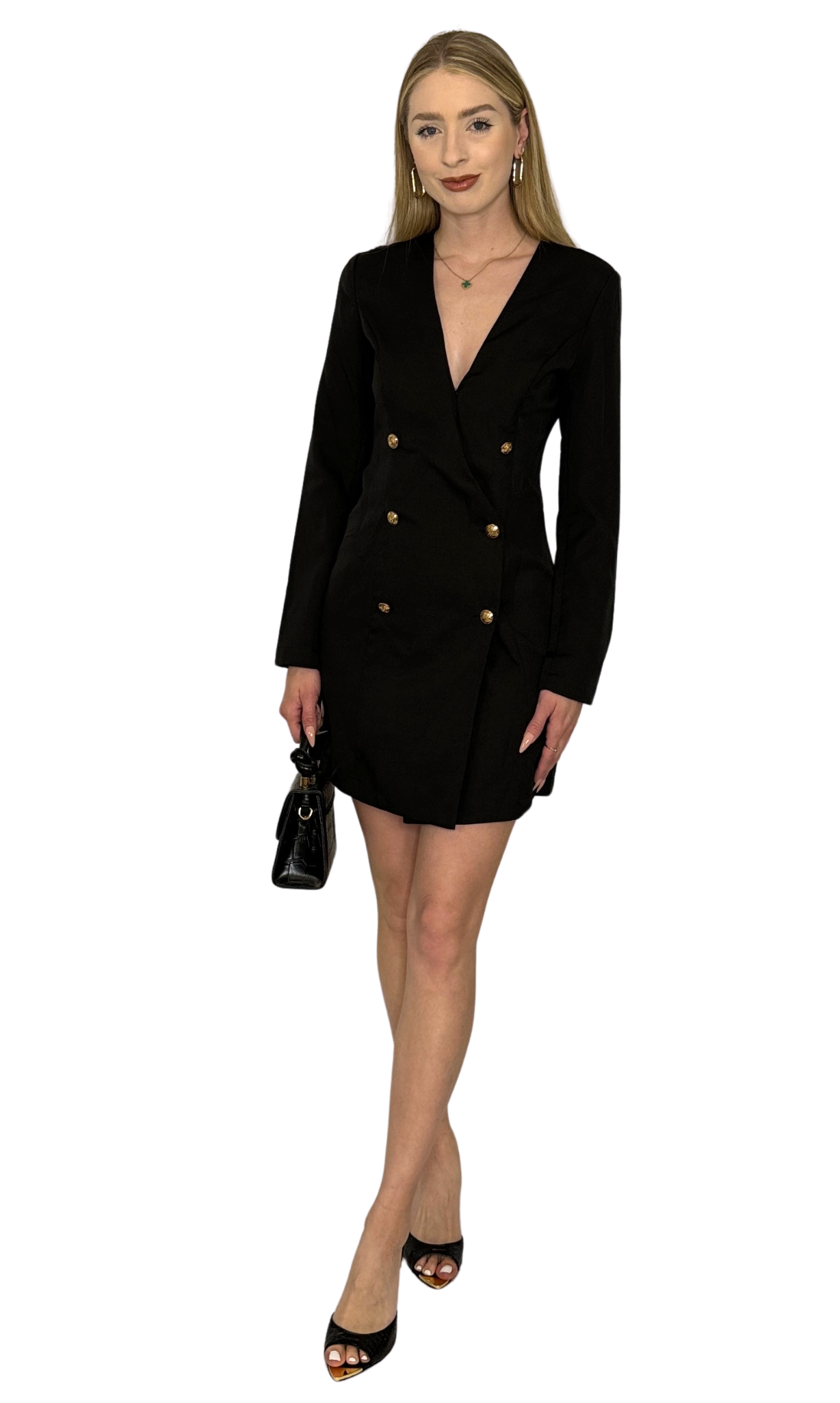 Black blazer style dress with gold accent buttons along the front. This classic little black dress pairs easily with almost any style and makes a great statement piece for any wardrobe.